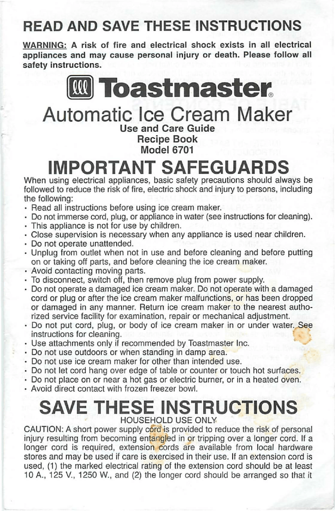 Toastmaster Ice Creamn Maker Model 6701 Use And Care Guide
